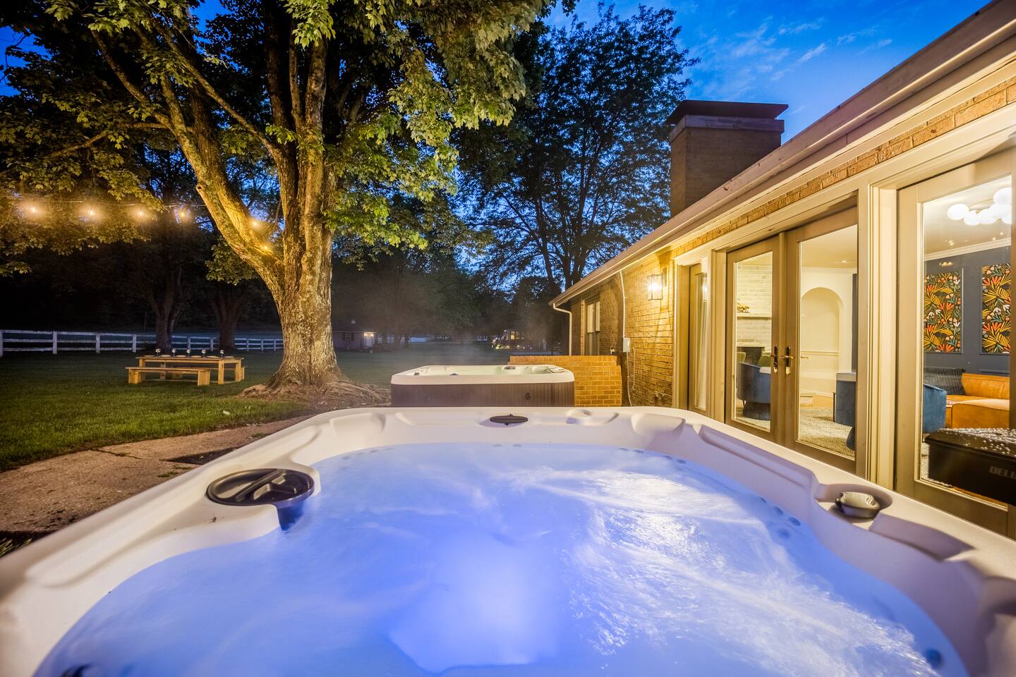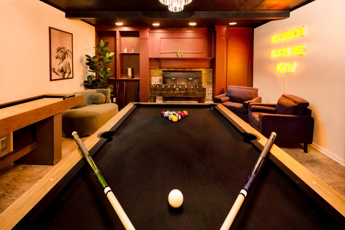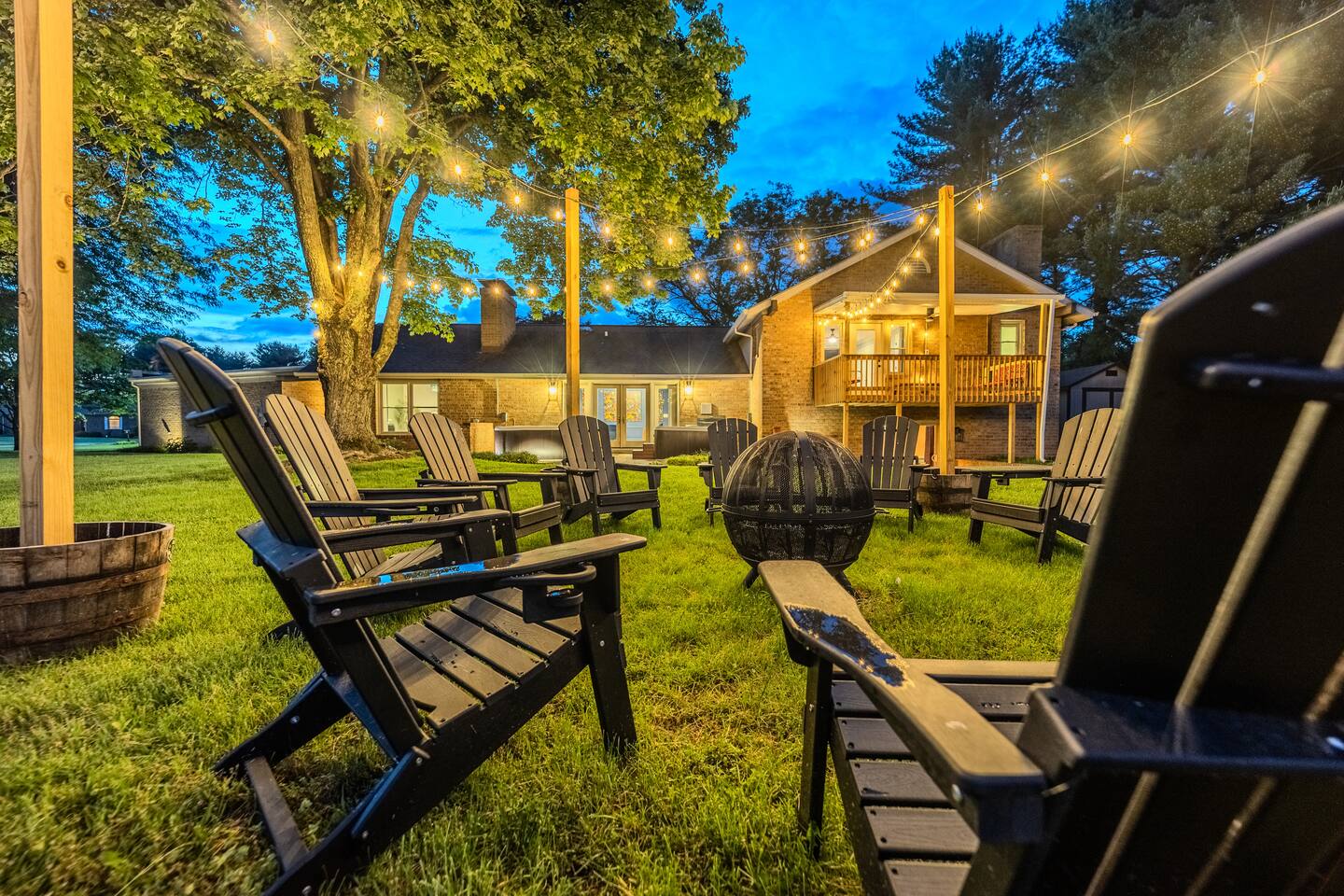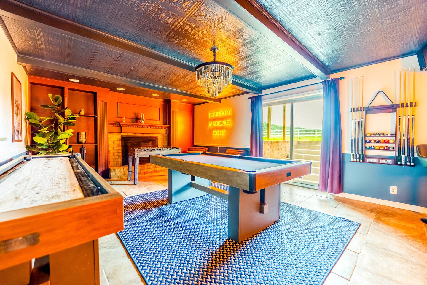 Experience bourbon country in style at this luxurious retreat just 5 miles from Buffalo Trace! With a speakeasy vibe and top-tier amenities, enjoy a game room with arcades, pool, foosball, shuffleboard, and karaoke. Unwind in two hot tubs, sip bourbon by the fire pit under the stars, or relax on the private deck overlooking serene farm views. Near distilleries, horse farms, and just an hour from the Kentucky Derby, this is the ultimate getaway for bourbon lovers and friends!
